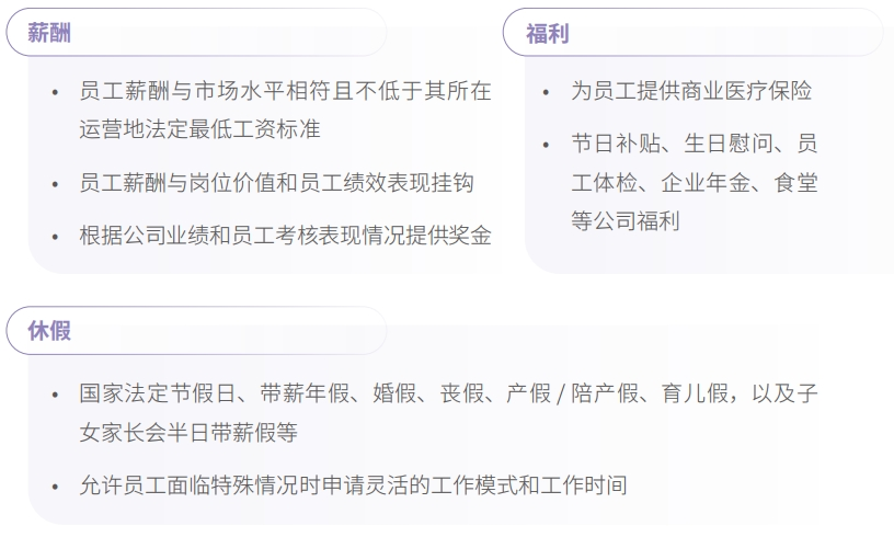 公司一直完善员工薪酬福利系统,以具有市场竞争力的薪酬水平吸引人才、激励人才,并按期开展组织效能剖析、薪酬市场对标事情,进一步优化薪酬政策或计划;为员工及其家人提供适当的生涯水平包管,并通过组织文体运动、帮扶难题员工、心理康健向导等切实提高员工职场幸福感。
